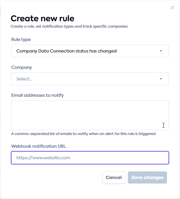 Click Create rule to open the new rule creation window. Select the rule type, apply it to all companies, and assign it a webhookWebhook An automated notification sent from Codat to your application when specific events occur, such as when data syncs complete or connections change status. URL. Make sure to replace the <server-url> with your forwarding address.